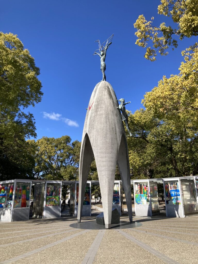 ここは、当時2歳だった女の子が被爆した10年後に白血病を発症し、元気になれるようにと千羽鶴を折っていたことから、平和を祈念して作られた場所だそうです。娘にとっても、自分たちと同じ子ども達がつらい思いをしていたことは、知るに堪えがたい、胸が痛む現実だったようです。